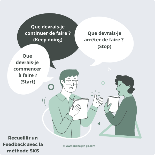 La méthode SKS, élaborée par Phil Daniels, professeur en psychologie à la Brigham Young University, facilite cette prise de parole à travers 3 types de questions orientées actions que vous posez aux membres de votre équipe pour recueillir des feedbacks :