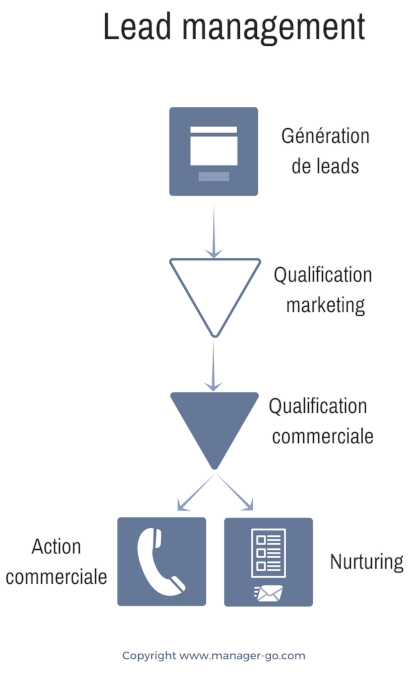 La première étape consiste à mettre en place des actions marketing et outils pour collecter des contacts. Il est également possible d'acheter ou louer des fichiers. Cette étape est fondamentale pour le lead management.